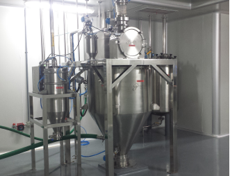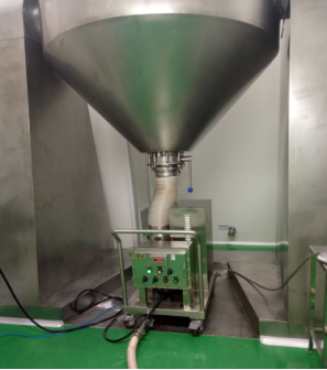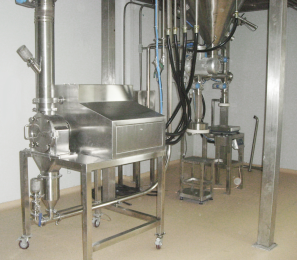 上图是组合式粉碎输送除尘系统,现被用于精粉式生产,分别包括CFJ-12型卧式粉碎机、周转料仓以及连续式真空除尘器,可实现80目以下的粉碎工作工作。设备间采用密封管道连接,保证了无菌化高效连续生产。