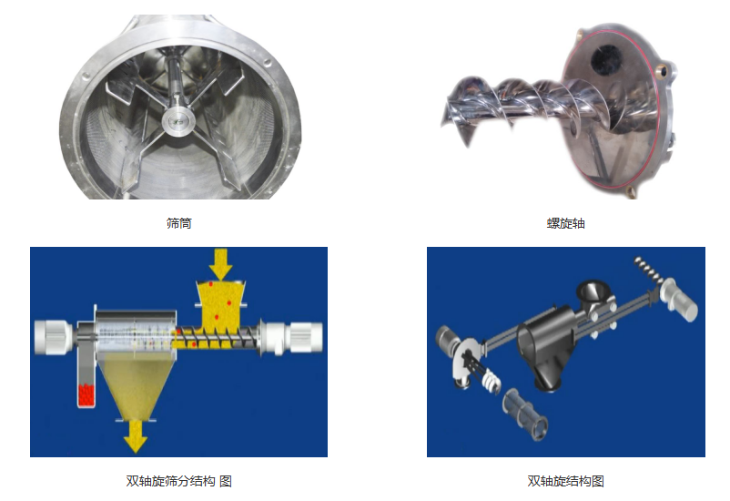 本系列筛分设备采用喂料螺杆与筛分部分独立驱动的设计,由两台电机分别控制喂料螺杆与旋转筛分仓。物料通过螺杆定量输入至旋转仓内,在旋转叶片的作用下被高效筛分、过滤,并自动排入储存仓。