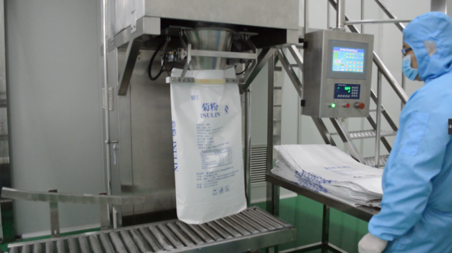 上图为称重包装检测一体生产线中的称重包装部分,现被用于某公司菊粉生产线的包装制作。采用高精度无尘灌装计量阀,称重精度±0.01%,包装部分根据菊粉的包装要求改变了连续灌装灌装头,使用了无尘自动夹袋器,也为后面的流水线检测提供了更多的便利。机身右侧设置了脚手架和大容量的料仓,不仅使添加物料更加方便、快捷,还能提供快速的设备清洗。