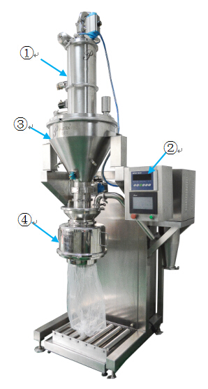 ①真空上料机 ②控制面板 ③缓冲料仓④无尘灌装头 ⑤梅特勒高进度台秤 ⑥电控箱