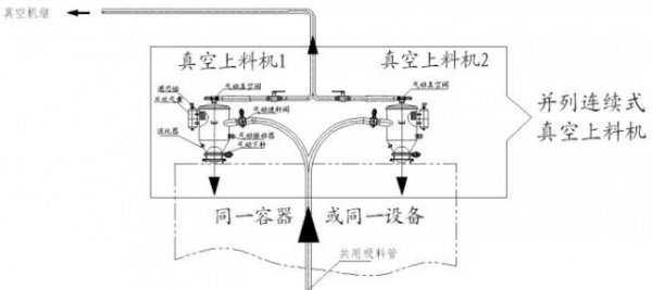通过将两台蝶阀式真空上料机并列,共用一根吸料管道,出料管道接在同一台设备或者容器上,并且并列的真空上料机共用一个真空源,实现物料的连续输送。